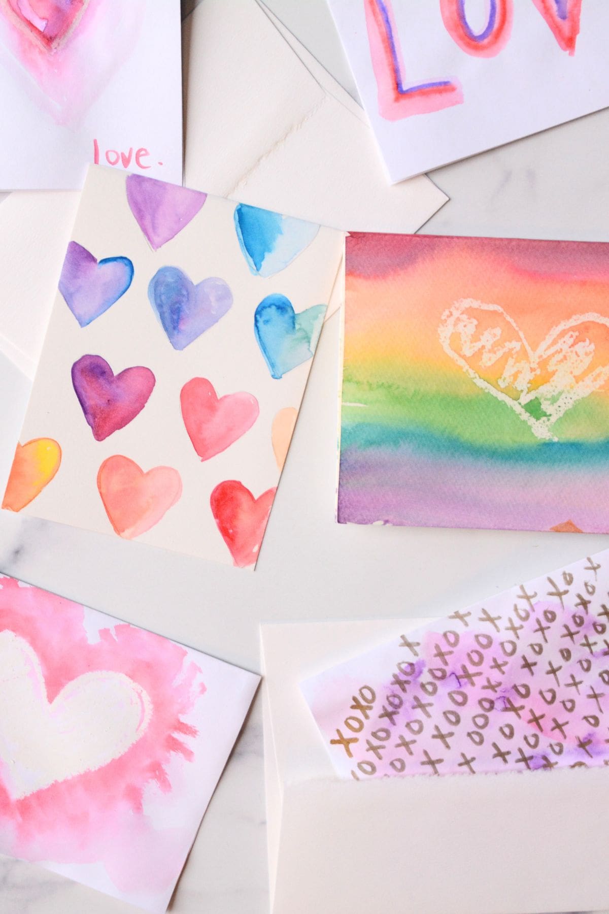 Kids can create their own set of watercolor cards to sell around different holidays. This example is perfect for Valentine's or Mother's Day. Experiment with simple shapes and watercolor techniques. Package the cards together with a fun ribbon or twine for an added touch.
